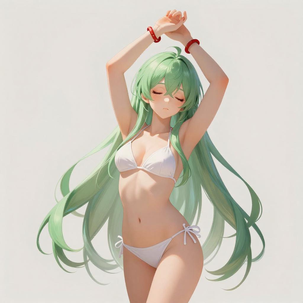 A digitally illustrated woman with long flowing pink hair poses in a green bikini while emerging from the ocean. The vibrant, high-resolution anime-style artwork captures the bright blue sky, sparkling water droplets, and dynamic movement of hair and waves, evoking a summery beach atmosphere.