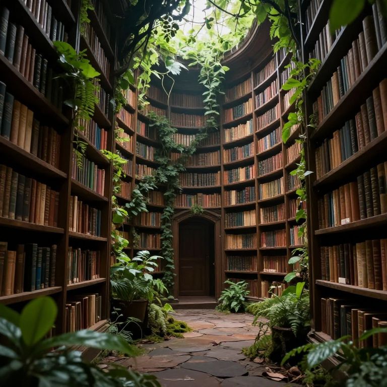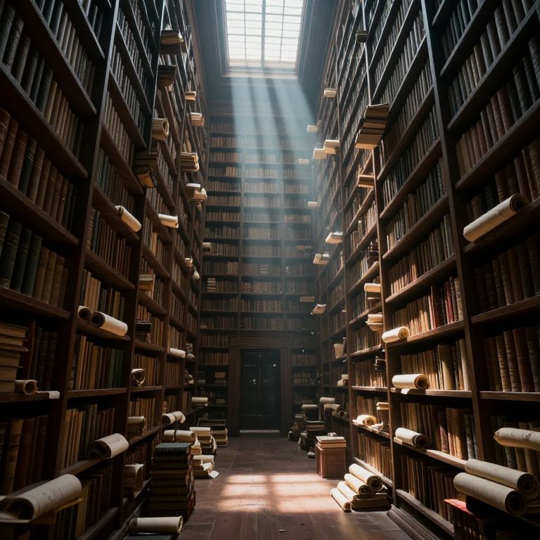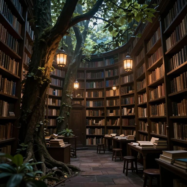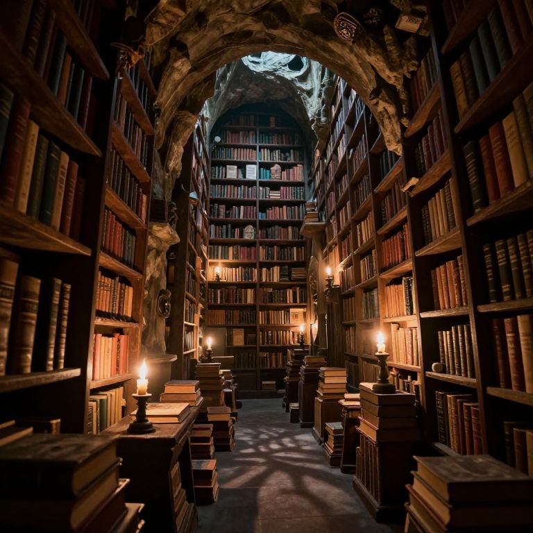 An enigmatic scene unveils an underground library hidden beneath city streets, reminiscent of surreal and dreamlike qualities. Soft, ethereal light casts dramatic shadows across ancient tomes and artifacts, creating an atmosphere of mystery and intrigue. From a \"worm's eye\" perspective, viewers are captivated by towering bookshelves that appear to meld with the arched contours of this cavernous subterranean world. As eyes adjust to the dimly lit atmosphere, mysterious whispers and flickering candlelight suggest untold stories lurking within these hallowed halls, evoking wonder as one wanders through this labyrinthine realm of knowledge and secrets waiting to be discovered.