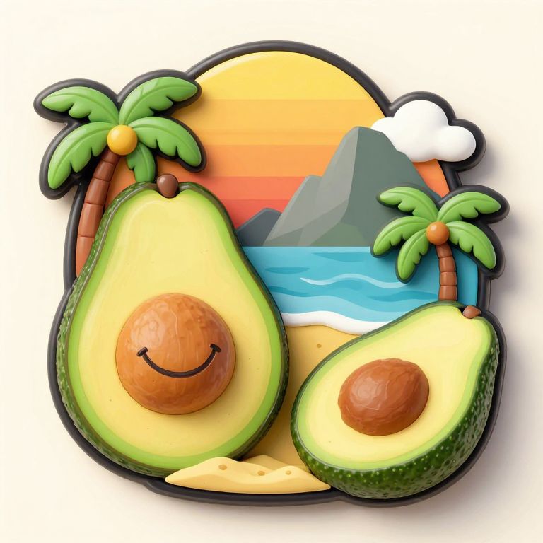 Imaginative adventure badges blend whimsical avocados with surreal landscapes, where halved fruits smile amidst palm trees on sandy shores, and mountains rise beneath sunsets, all infused with playful creativity.