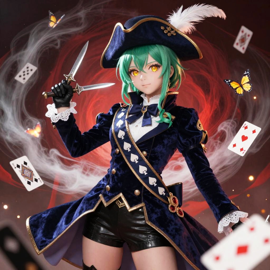 Anime style female character with emerald green hair and amber-gold eyes, wearing a midnight corsair illusionist uniform with velvet tailcoat, lace cuffs, a sash embroidered with card suits, and a feathered tricorn hat, holding silver throwing knives and spectral butterflies, surrounded by floating playing cards. The scene features a dynamic swirling smoky background with bright red and white highlights, intricate costume details, sharp expressive eyes, and an energetic and magical atmosphere. Rendered in high contrast and vibrant colors as detailed digital art.