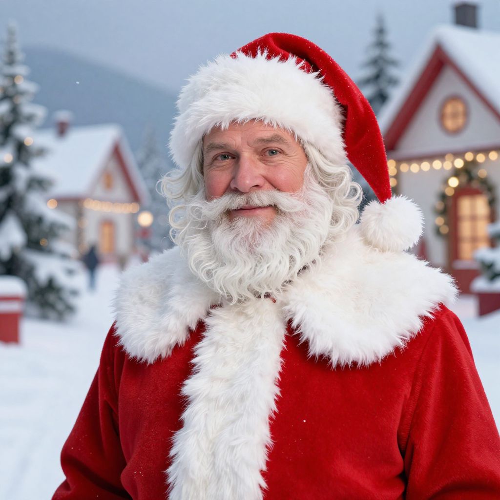 A man wearing a detailed red and white Santa suit with a prominent white fur collar, standing in a snowy winter scene with a festive atmosphere. He has a warm, friendly expression, with a gentle smile and twinkling eyes, adding to the joyful and holiday spirit. The background features a snowy Christmas village with twinkling lights, pine trees, and a red-and-white decorated roofline, enhancing the festive ambiance.