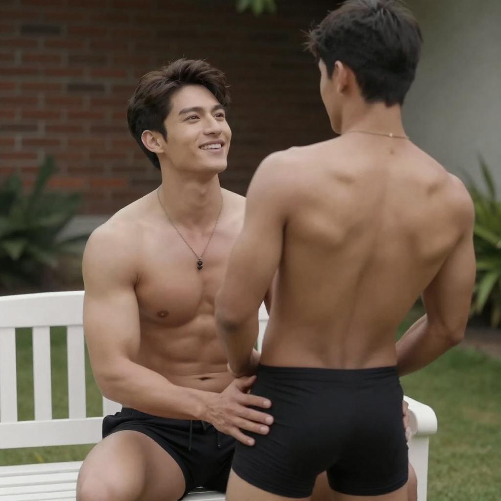 Photograph of two muscular, young men in a tropical garden. One man, kneeling with a defined six-pack, wears red and yellow swim trunks, looking up at the other. The standing man, with a toned back and wearing white swim trunks, faces away. Lush green plants and a large potted palm are in the background.
