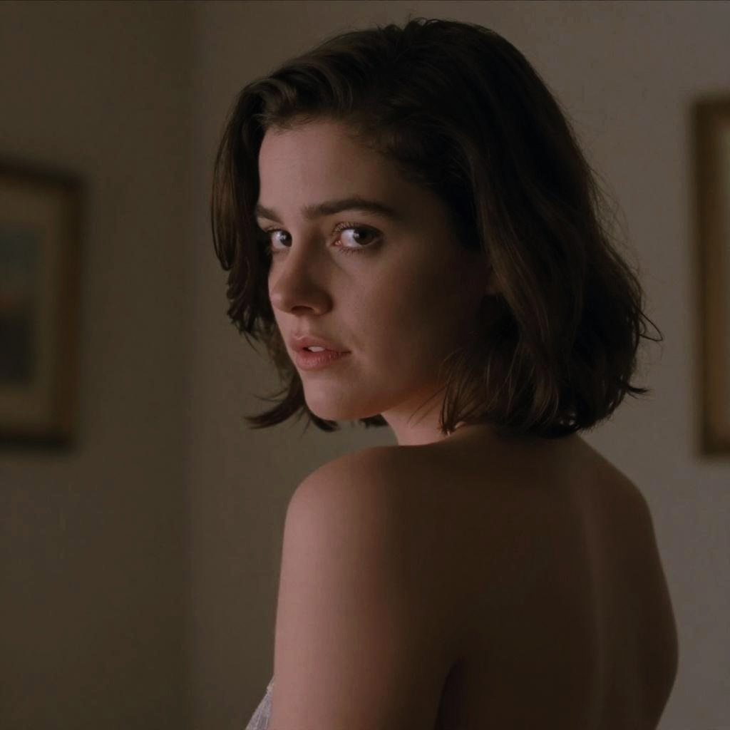 Photograph of a young woman with fair skin and shoulder-length, tousled brown hair. She has dark brown eyes and slightly parted lips, giving her a serious expression. She is wearing a sleeveless, sequined top with a plunging neckline, adorned with small, colorful beads. The background is slightly blurred, featuring a white wall with a blue tile border and a framed mirror. Her skin has a subtle sheen, possibly from sweat or makeup. The lighting is soft, highlighting her facial features and the texture of her hair.