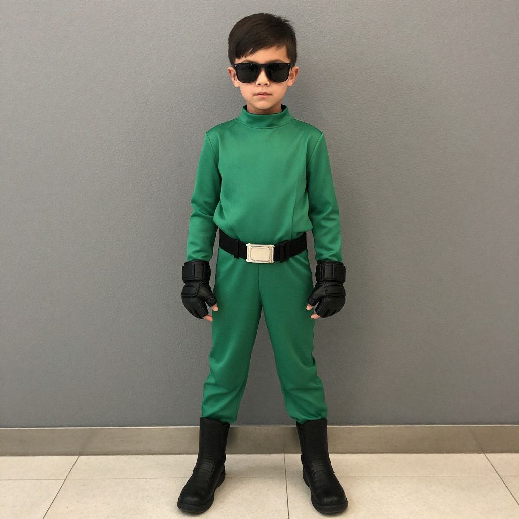 Photograph of a young boy standing against a plain gray wall. He has short, dark hair and wears black sunglasses. His outfit consists of a green, long-sleeved, turtleneck jumpsuit with black gloves and a black belt with a square white buckle. He also wears black boots. The floor is white tile. The boy's expression is neutral, and he stands with his arms slightly away from his body, feet shoulder-width apart. The overall style is reminiscent of a superhero costume.