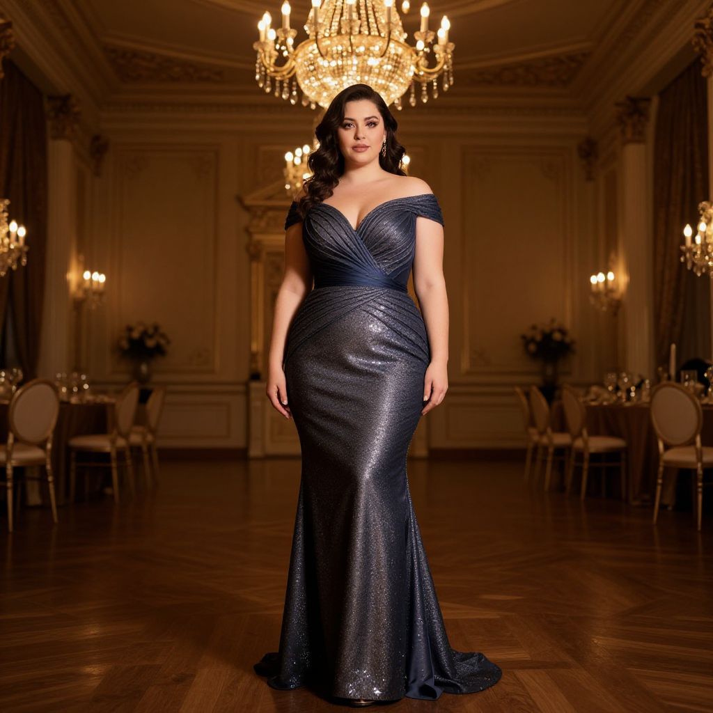 Photograph of a plus-size woman with long dark hair wearing a sparkly, off-shoulder navy blue evening gown, standing in an elegant,