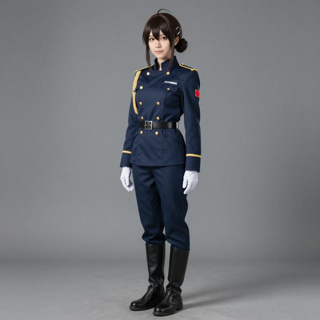This is a digital CGI image of a young Asian woman standing against a plain gray background. She is dressed in a dark blue military-style uniform with gold stripes on the sleeves, a red armband on the right arm, and white gloves. Her black hair is styled in a neat bun with bangs, and she has a fair complexion. The uniform includes a belted waist and black boots. She stands straight with a neutral expression, and the lighting is even, highlighting the details of her uniform and the texture of the fabric.