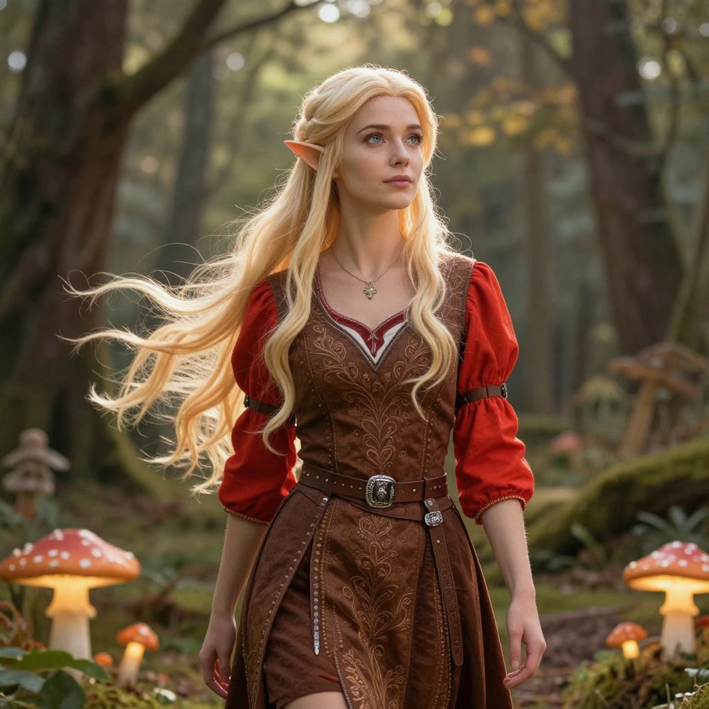 A graceful female elf with long, flowing blonde hair that gently cascades down her back, glowing softly with a subtle ethereal light. She wears a stylish brown outfit featuring delicate embroidery, with vibrant red sleeves that add a touch of warmth and contrast. The outfit is completed by a brown belt adorned with small silver clasps, giving it a refined and elegant look. She stands confidently in a sun-dappled forest clearing, her eyes shining with wisdom and curiosity, surrounded by mystical plants and glowing mushrooms. The atmosphere is serene and magical, with a soft breeze rustling through the trees, enhancing the enchanting vibe of the scene.