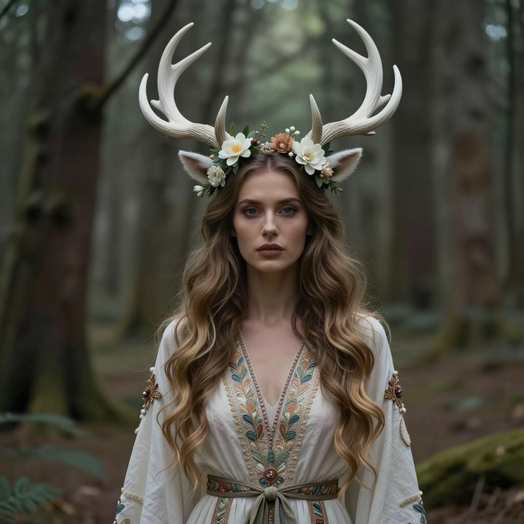A mystical woman stands in an enchanted forest, adorned with a crown of large white antlers and flowers, evoking a majestic, ethereal presence. Her long, wavy hair and intricately embroidered gown enhance the fantasy aesthetic in this beautifully composed, realistic-style portrait.