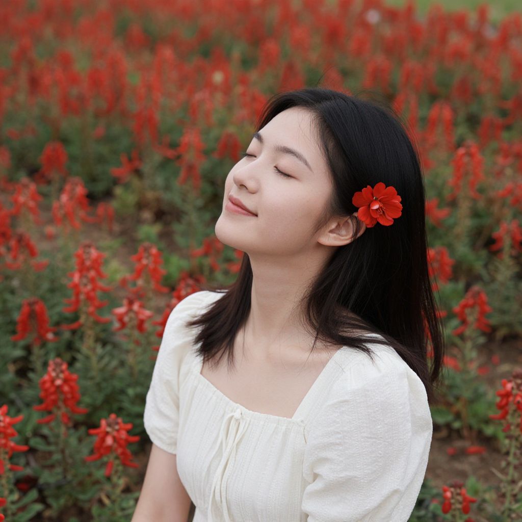 Embracing serenity amidst a vibrant sea of red blooms, the young woman's closed eyes and gentle smile evoke a profound sense of peace, freedom, and connection to the ephemeral beauty of nature.