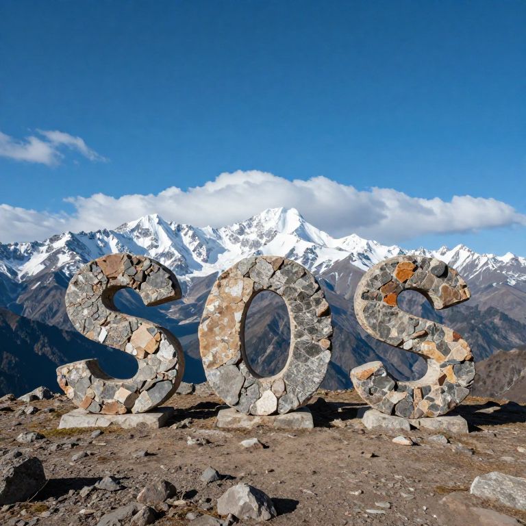 Sos message spelled out in large rocks on a rugged mountain plateau, snowy peaks in the background, clear blue sky with soft clouds, hyper-realistic style emphasizing natural elements and high contrast shadows
