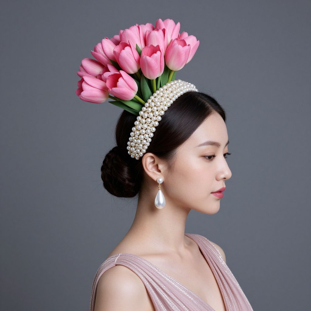 Elegant profile of a woman wearing the Empress of the Rose Couture Headpiece by Honeydrops Designs, featuring a cascade of vibrant pink tulips atop a pearl-embellished band, complemented by matching pearl earrings and a shimmering pink dress.