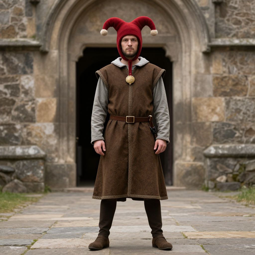 Medieval fool costume, man in medieval costume standing in front of a stone building
