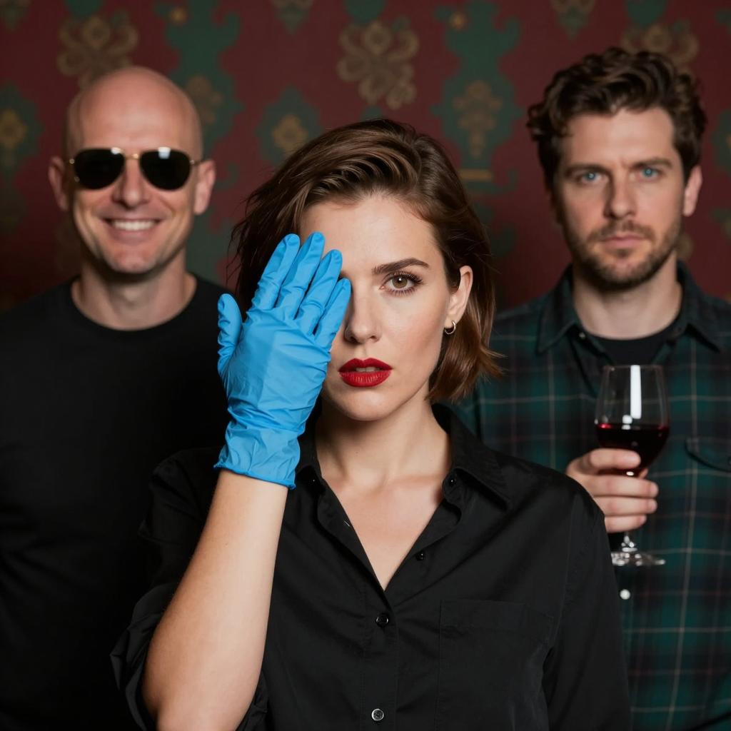 Three people in a dimly lit room. Central woman with short brown hair, red lipstick, black shirt, wearing blue latex glove, hand raised to eye, intense expression. Bald man with sunglasses in black shirt behind her, smiling. Man on right with dark hair, green plaid shirt, holding glass of red wine, looking forward. Patterned red and green background.