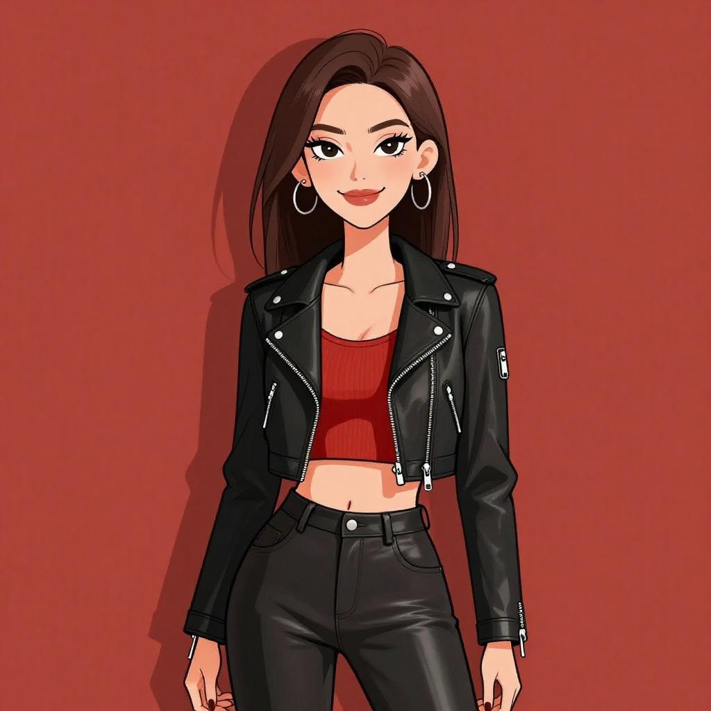 Woman with pretty face and pretty hair. smiling Woman, edgy, black cropped moto jacket with asymmetrical zipper, ribbed red underlayer, high-waist faux leather pants, sleek straight hair. --sref 1467