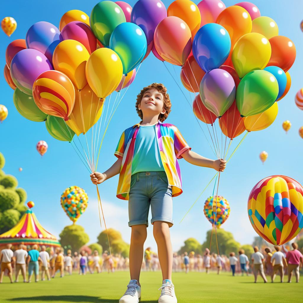 A cheerful young boy with curly hair wearing a blue striped t-shirt and orange shorts holding a large bunch of multicolored balloons at a vibrant carnival in a sunny park. The background features colorful balloon-shaped trees and festive tents with crowds of people enjoying the event.