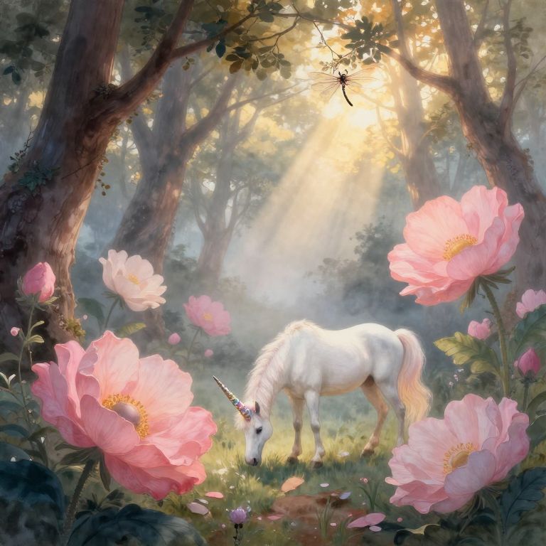 Envision an enchanting forest at dawn, where soft mist weaves through ancient trees and oversized flowers in a dreamlike setting reminiscent of Renaissance oil painting techniques blended with the delicate grace of Japanese ink wash paintings. The scene transitions from soft rosy hues to golden midday sunrays filtering through leaves, casting dappled light on a solitary unicorn grazing peacefully among the surreal blossoms. Its iridescent horn reflects the mesmerizing glow, evoking both wonder and tranquility in this whimsical dragonfly's perspective of an oversized flower-strewn forest, where nature's beauty transcends reality.