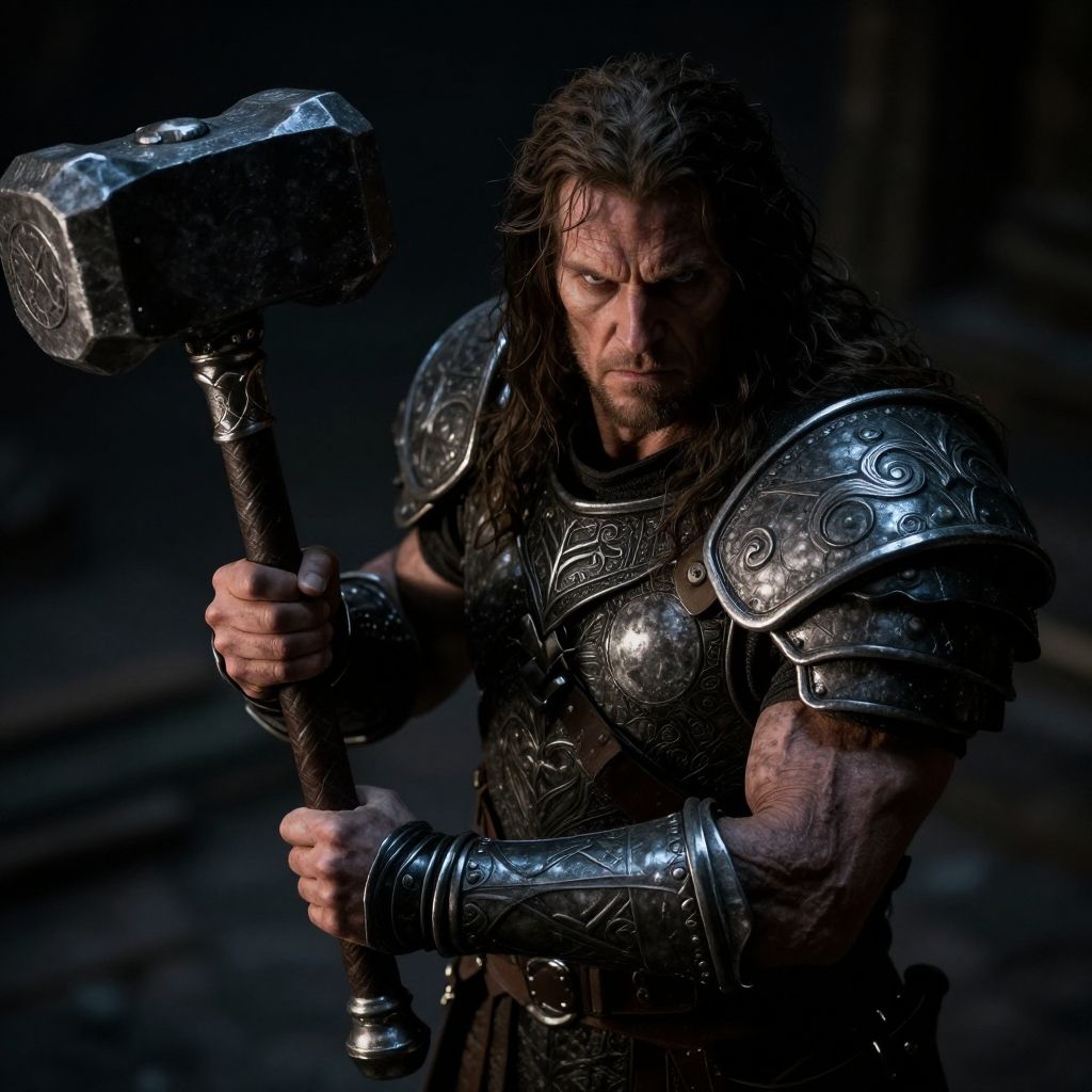 Photograph of a muscular, bearded man with long, dark, wet hair, standing in a dimly lit, dark background. He wears ornate, silver armor with intricate patterns, and grips a large, silver war hammer with both hands. His expression is intense and focused. The armor reflects light, creating a shiny texture, while his weathered skin contrasts with the metallic sheen. The overall tone of the image is dark and moody, emphasizing the warrior's strength and determination. The background is blurred and indistinct, drawing attention to the warrior's detailed armor and imposing presence.