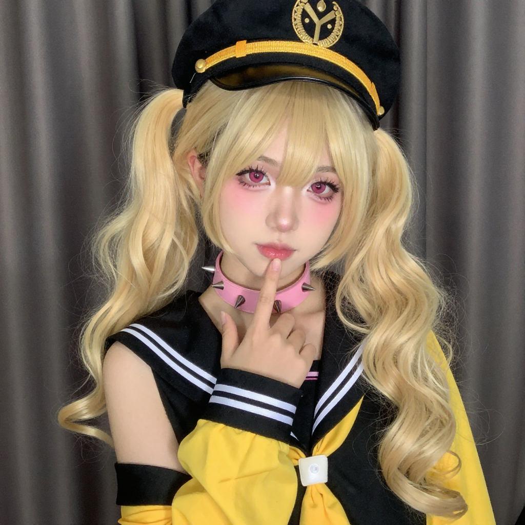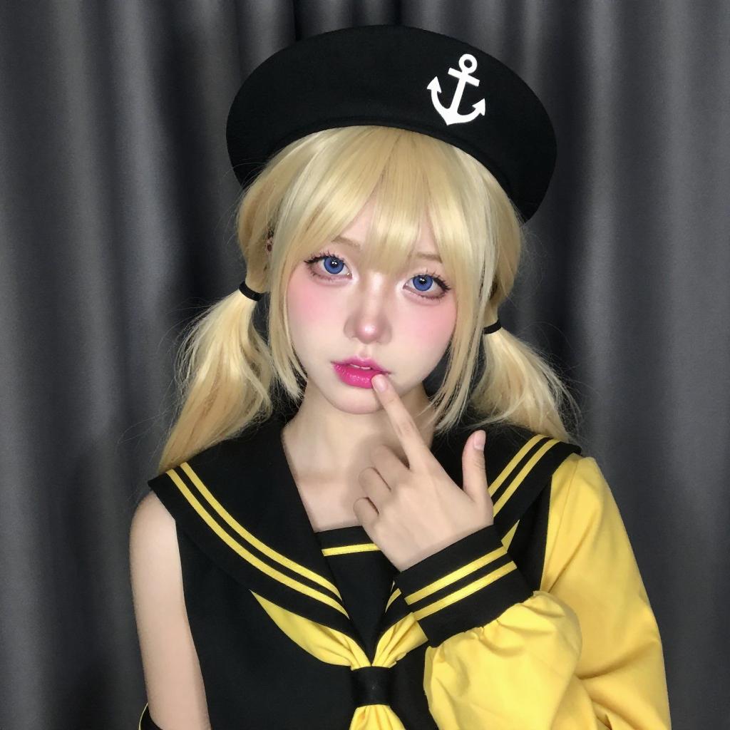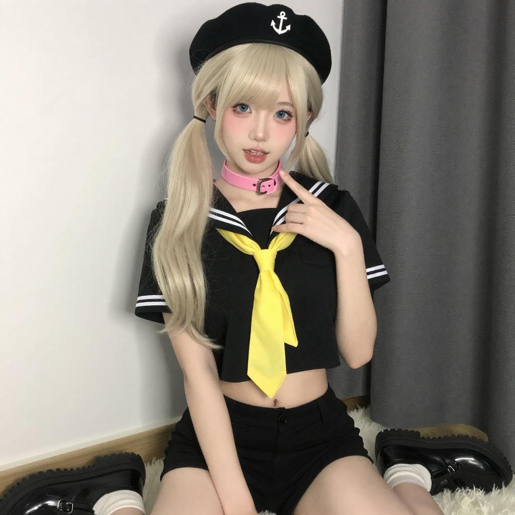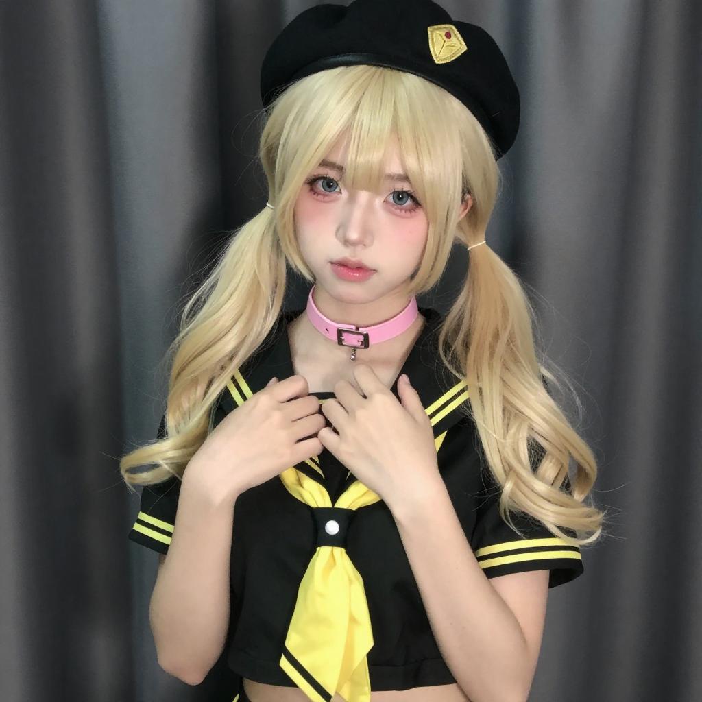 Photograph of a young person with pale skin and long, platinum blonde hair in pigtails, wearing a black sailor-style outfit with a yellow necktie, black beret with gold embellishments, pink choker with a ring, and black gloves. They have pink eyeshadow, heavy eyeliner, and red lipstick, looking upwards with a pouty expression. Dark curtains are in the background.