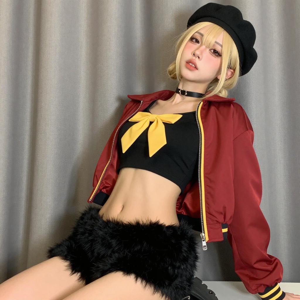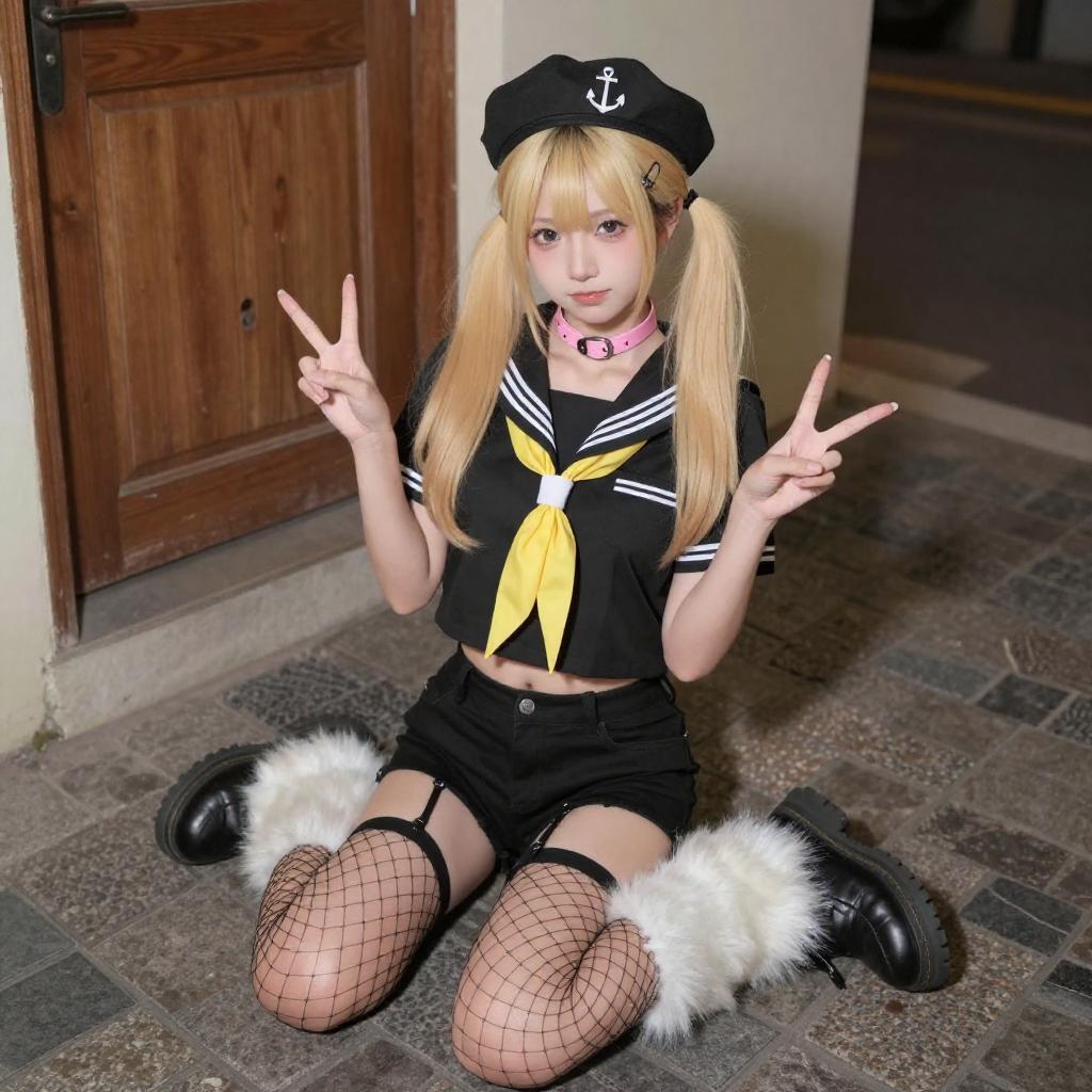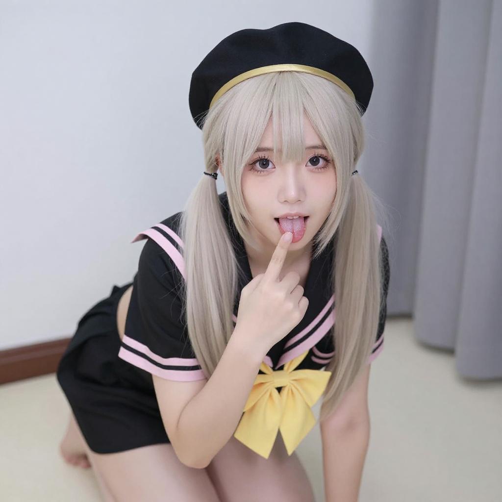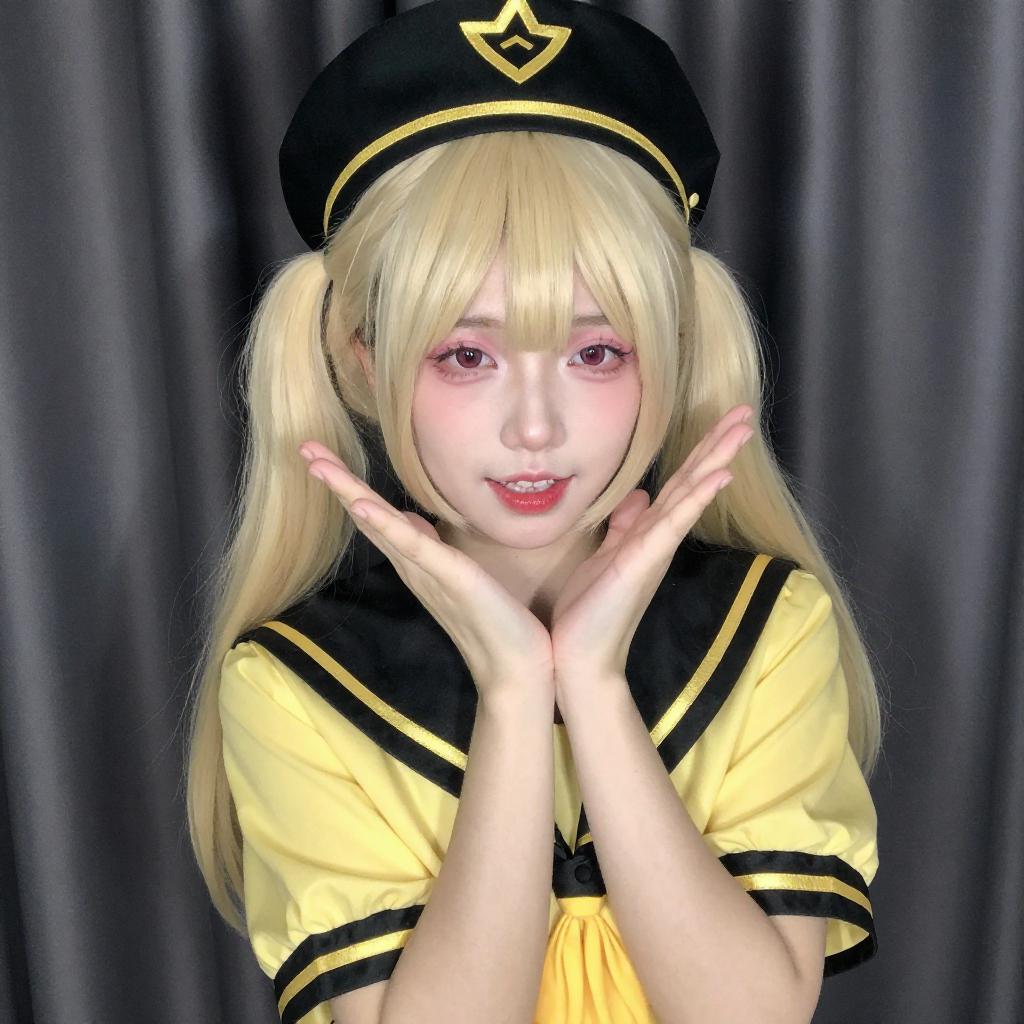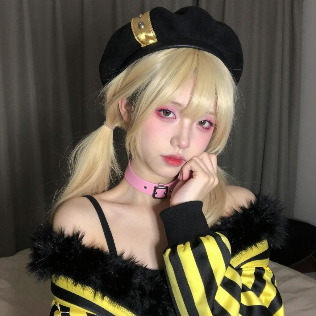 Photograph of a young person with pale skin and long, platinum blonde hair in pigtails, wearing a black sailor-style outfit with a yellow necktie, black beret with gold embellishments, pink choker with a ring, and black gloves. They have pink eyeshadow, heavy eyeliner, and red lipstick, looking upwards with a pouty expression. Dark curtains are in the background.