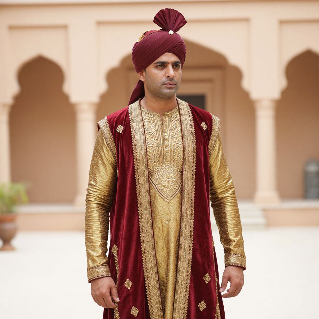 Indian Dressing Costume, a man in a turban and a red and gold outfit
