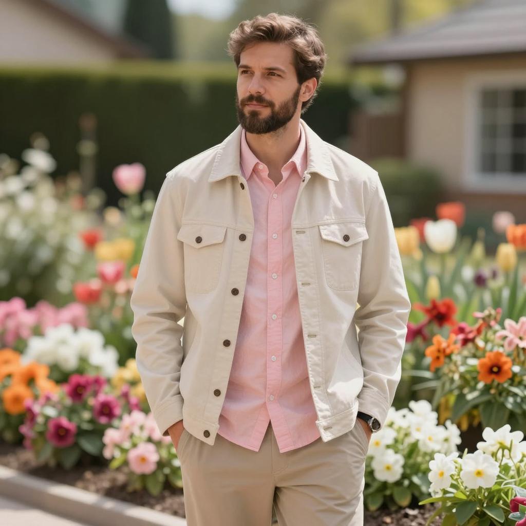 Bluntman costume, photograph of a man standing on a concrete runway, daylight, modern architecture background, brown hair, beard, wearing a mustard yellow jacket, blue denim shirt, mustard yellow pants, brown belt, brown shoes, black backpack strap on right shoulder, holding a black object in right hand, slight smile, casual style, relaxed posture, clear sky, bright sunlight, shadows on ground, realistic style, fashion photography, contemporary, full body shot