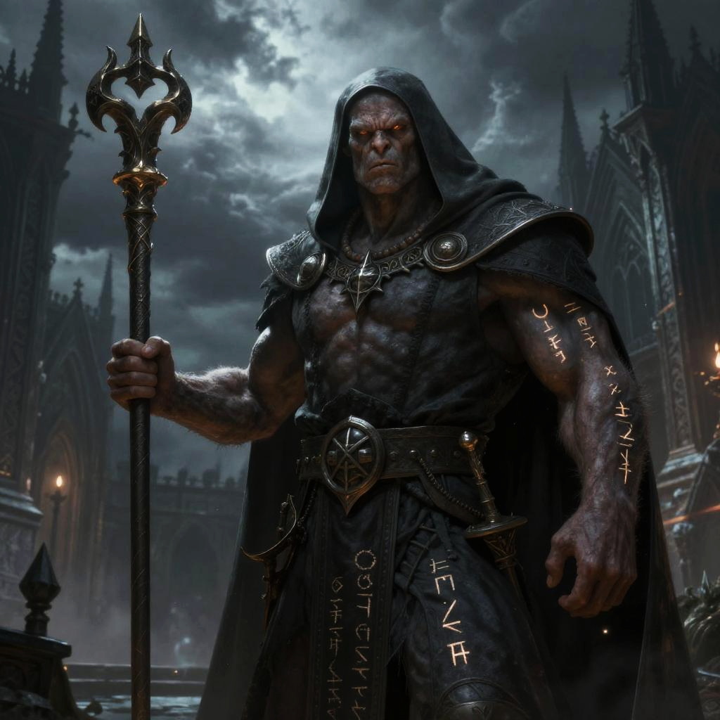Digital fantasy artwork depicting a fierce warrior in dark, armored clothing with a hood, crouched in a ruins-filled setting. He wields a gleaming sword in his right hand, with a second sword strapped to his back. His face is grim and focused, with intense eyes and a scowl. The armor is dark brown with intricate details, and he wears leather straps and belts. The background features crumbling, ancient stone arches bathed in sunlight, with debris scattered on the ground. The atmosphere is gritty and dramatic, with dust and light creating a stark, heroic contrast.
