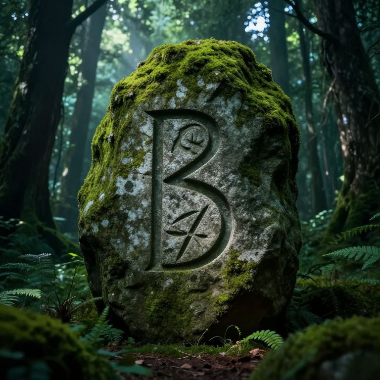 B6 mysterious ancient rune carved into a moss-covered stone, surrounded by dense enchanted forest with rays of light breaking through trees, high detail texture on stone and plants, magical fantasy atmosphere