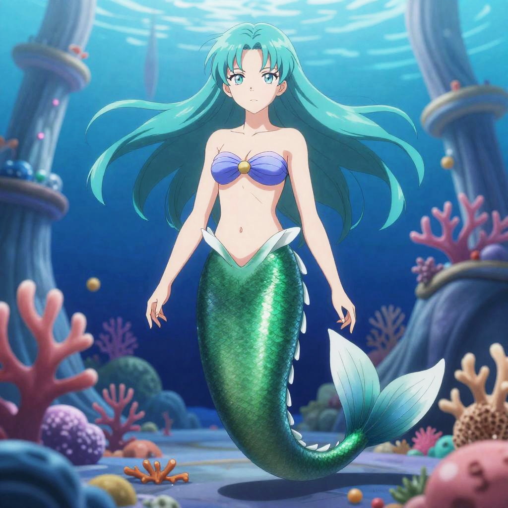 Ecchi art of merfolk empress standing confidently in a bioluminescent coral palace, her turquoise hair flowing in the wind, intense gaze, high-detail anime rendering