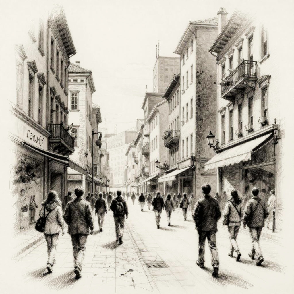 Hand-drawn sketch depicting a bustling city street scene with crowds of people walking along sidewalks lined by multi-story buildings. The image features intricate line work, dynamic perspective, and lightly shaded facades, all rendered in black and white with charcoal texture, conveying a vintage photo aesthetic.