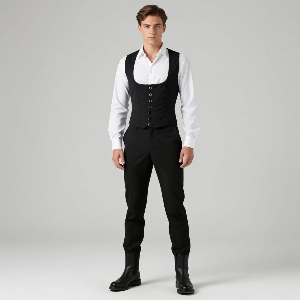 Male wearing a black outfit with a white shirt and black pants. The outfit has a corset and a pair of black boots. The man has short brown hair.