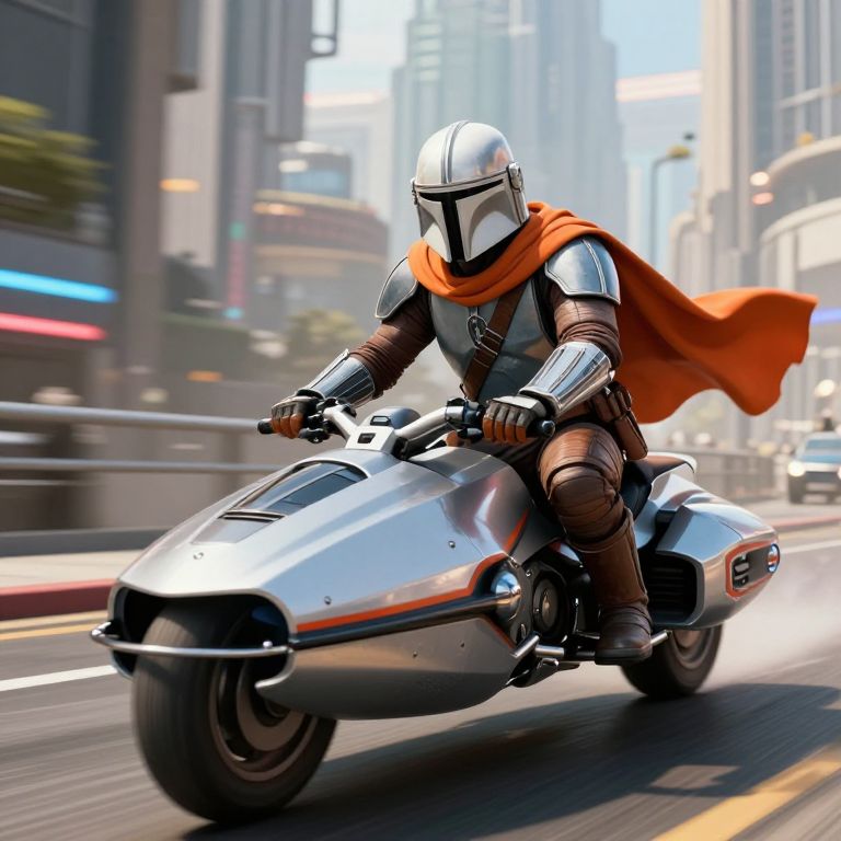 Photorealistic digital artwork of a Mandalorian-style warrior in full silver armor with a white helmet and orange cape, riding a sleek, silver futuristic motorcycle on a bustling urban street. The background features blurred skyscrapers and neon lights, suggesting high-speed movement. The motorcycle has a streamlined design with orange accents and black tires. The warrior grips the handlebars confidently, exuding a sense of dynamic motion and heroic presence. The image combines elements of science fiction and action, with a focus on vibrant colors and detailed textures.