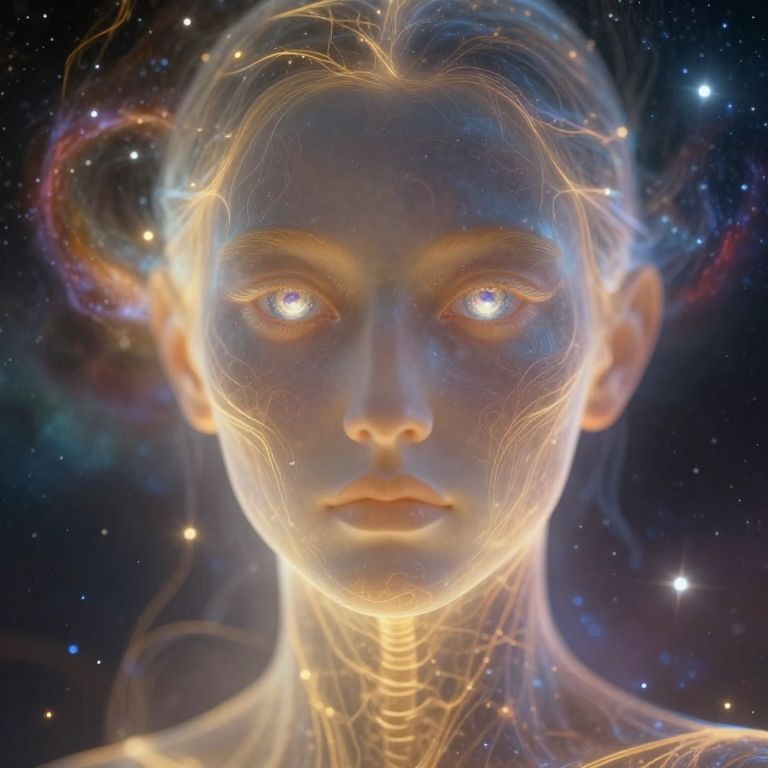 Envision an enchanting digital art portrait characterized by intricate details and profound spiritual depth. The subject is a mystical, ethereal figure with translucent skin revealing their internal structures and energy pathways, bathed in gentle golden light from an unseen source. This close-up view captures the serene expression on their face, with intricately detailed eyes that seem to hold the universe within them. The background showcases a nebula-like swirl of cosmic colors and glowing celestial bodies, evoking a sense of spiritual transcendence and interconnectedness with the cosmos, creating an emotional gradient that inspires awe, wonder, and profound introspection.