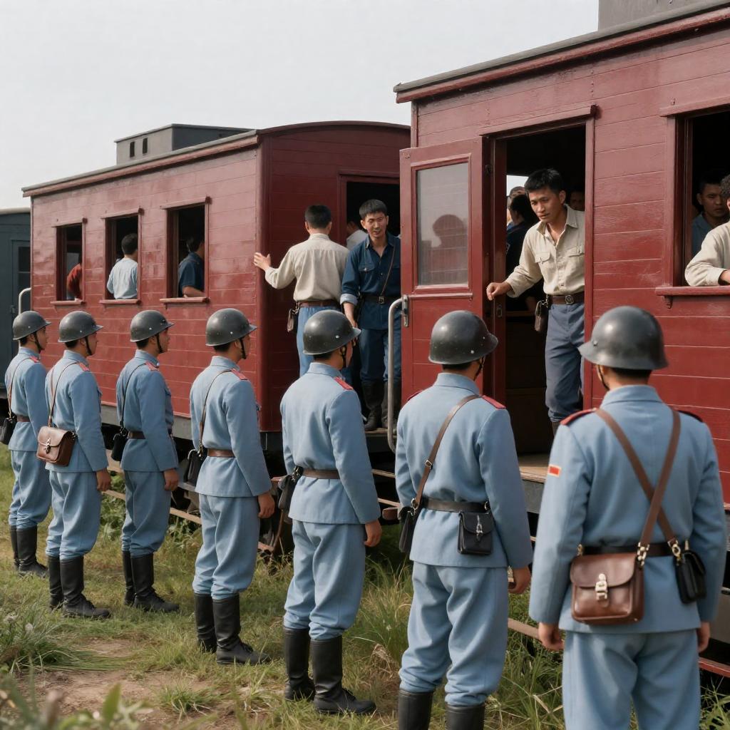 Photograph of a historical scene. Red wooden train cars with open doors, crowded with people. Soldiers in light blue uniforms with helmets, standing in grassy field, facing train. Crowds inside train carriages, some looking out, others entering. Clear sky background. Soldiers with backpacks, one with brown satchel. Multiple people, intense expressions.