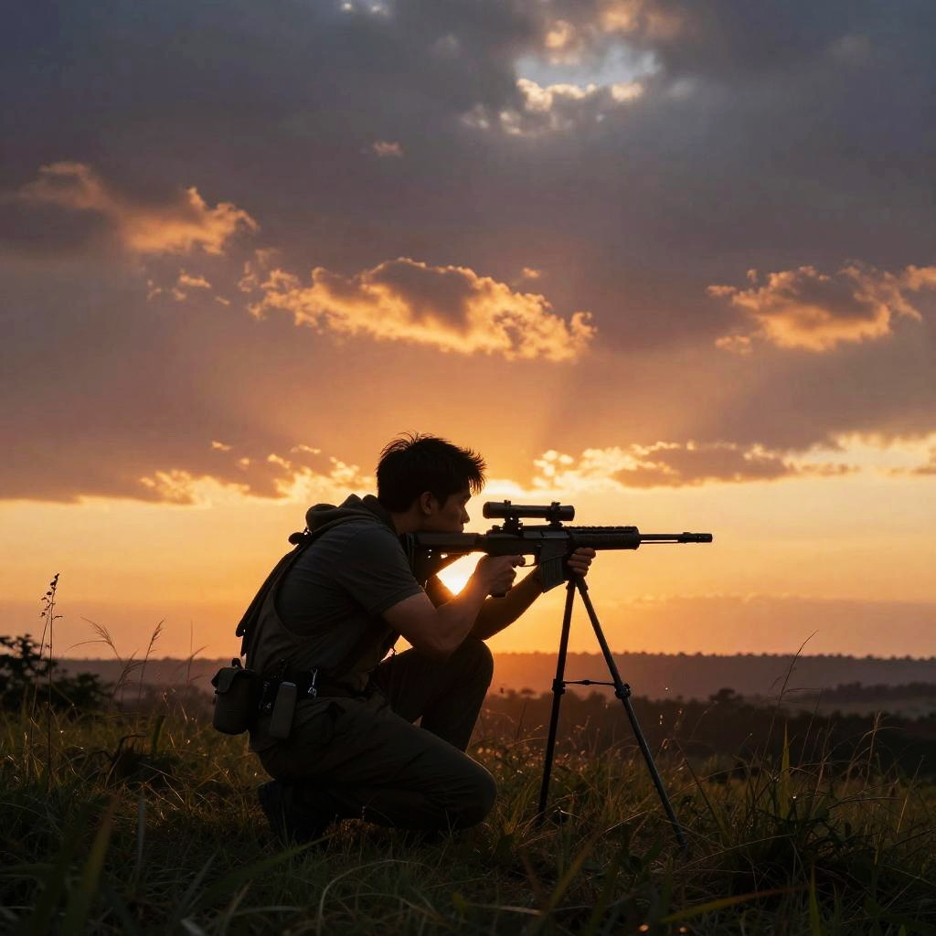 Sniper prone on grassy hill, vibrant sunset in the background, silhouette effect, cinematic wide shot, ultra-realistic nature elements