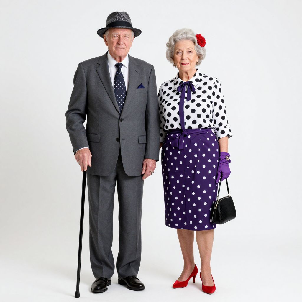 In this hyper-realistic, 8k image, a senior citizen couple stands side by side against a stark white background. The man, with his grey hair neatly combed, dons a stylish fedora and a crisp suit with a polka-dotted tie and pocket square. His hands are adorned with rings, and he holds a walking cane. The woman, also with grey hair, wears a blouse with polka dots and a matching skirt, accessorized with a red flower in her hair, purple gloves, and red high heels. She carries a black purse and holds a pair of gloves in her hand. Their attire and accessories are meticulously detailed, capturing the essence of their personalities and the era they represent. The composition is balanced, with the couple centrally positioned, creating a harmonious and visually appealing scene.