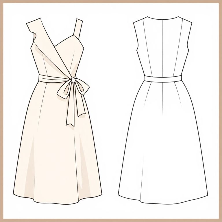 This is a digital line drawing of a sleeveless dress shown from both the front and back. The dress has a V-neck and an asymmetrical cut with one shoulder slightly higher than the other. It features a tied ribbon at the waist, adding a decorative touch. The front view reveals a flowing, knee-length skirt, while the back view shows a simple, straight cut. The drawing is done in a clean, minimalist style with black lines on a white background, and a subtle beige color is used to suggest the fabric's texture.