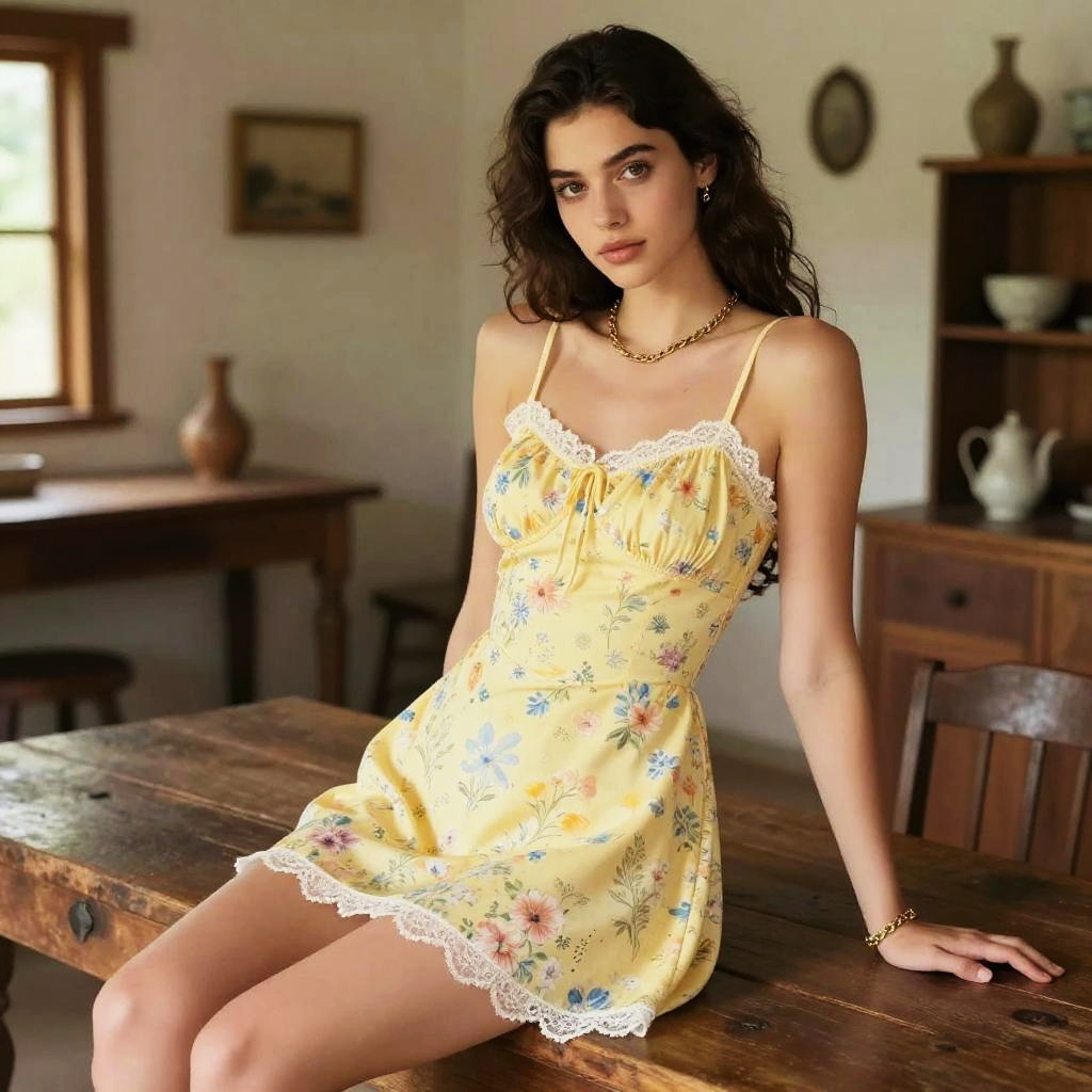 Woman in Bohemian Dress Sitting in Farmhouse Kitchen