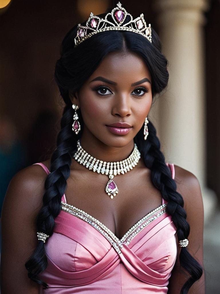 Sorority costume party, 1girl, jewelry, brown hair, earrings, long hair, realistic, necklace, solo, dark skin, lips, brown eyes