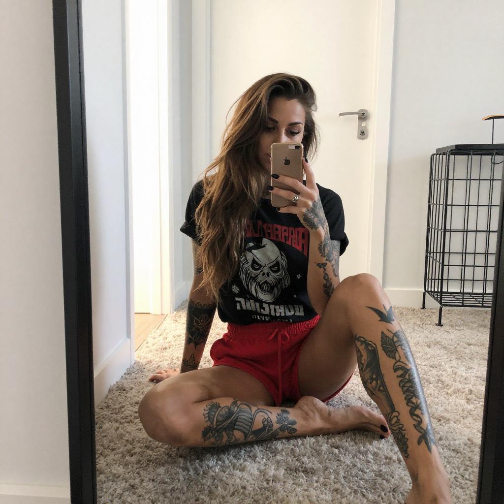 Photograph of a tattooed woman with long brown hair, sitting on a carpeted floor, taking a mirror selfie. She wears a black graphic t-shirt and red shorts, showcasing colorful tattoos on her arms and legs. Her feet are bare, and she holds a black phone with a red case. The background includes a white wall, a wooden cabinet, and a bright blue-lit window.