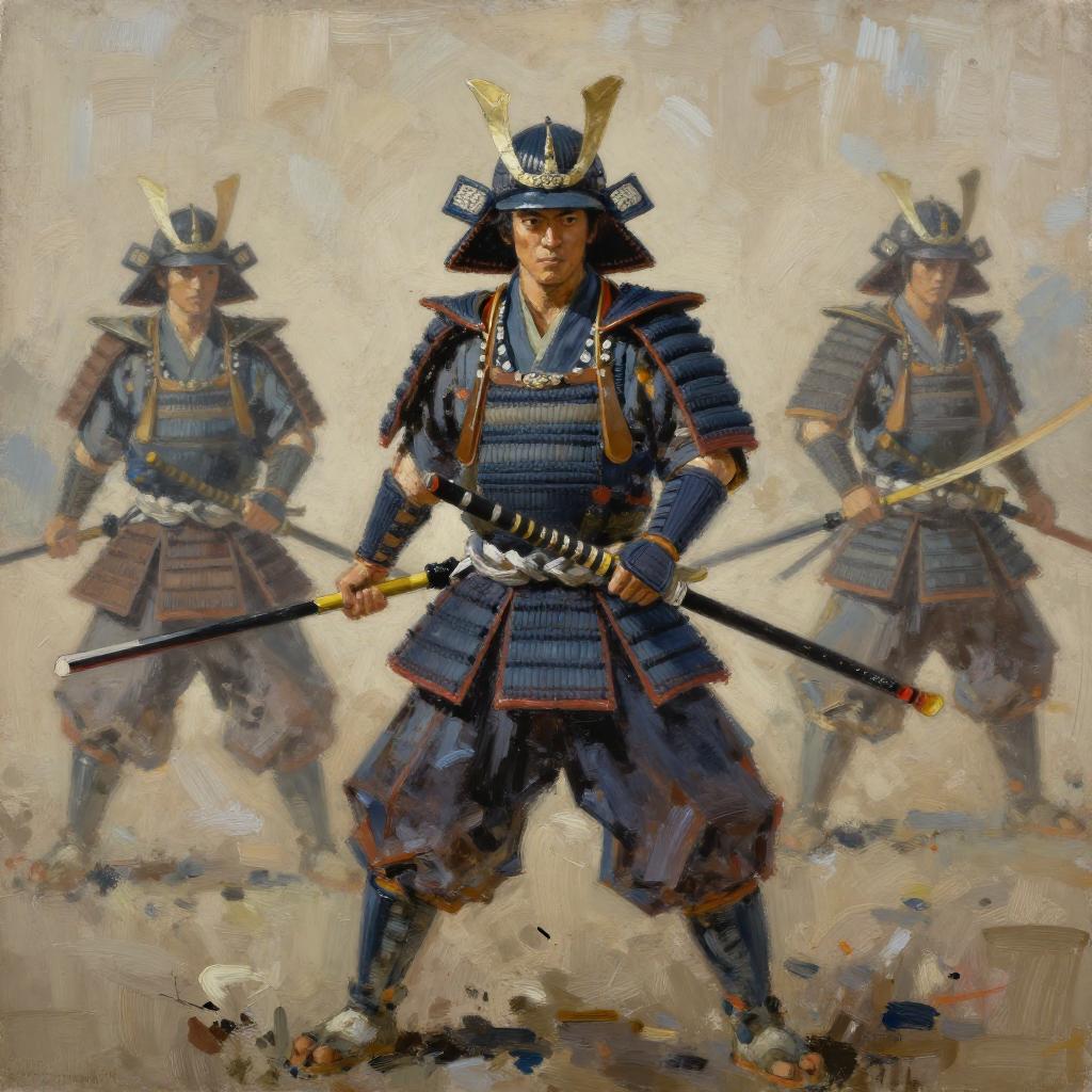 Digital painting of three samurai warriors in traditional blue and black armor, standing in a readiness stance with swords in hand. The central figure, a young Asian man with a focused expression, is slightly in front of the other two, who are slightly blurred. They wear ornate helmets with golden accents, layered armor, and white belts. The background is a textured, dusty beige, suggesting a battle scene. The art style is realistic with a slightly impressionistic touch, highlighting the detailed textures of the armor and the dynamic poses of the warriors.