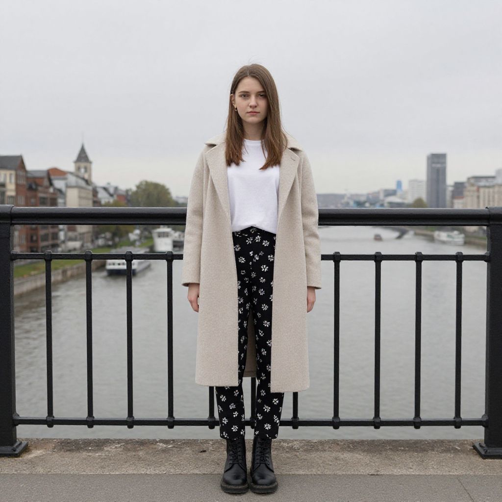 Photograph of a young woman standing on a bridge with a cityscape and river in the background. She has straight brown hair, fair skin, and is wearing a white t-shirt, black floral pants, a beige wool coat, and black boots. The bridge's black iron railing is behind her, and the overcast sky adds a muted, grayish tone to the scene.