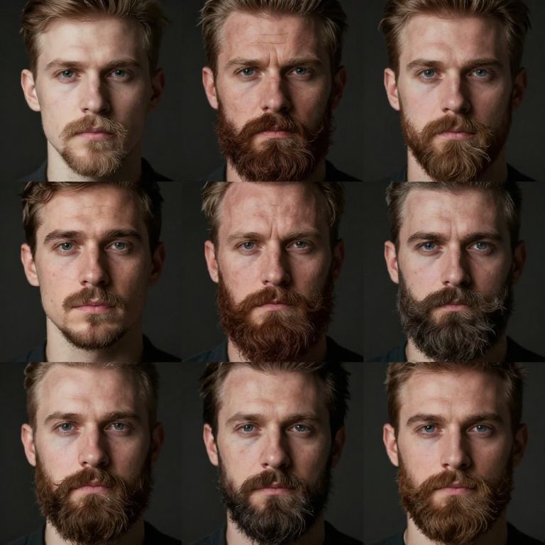 Beard styles without mustache, featuring diverse shapes like goatees, chin straps, and full beards trimmed ignoring the upper lip, showcased on a variety of male faces, in a realistic, high detail portrait style with moody lighting and soft shadows.