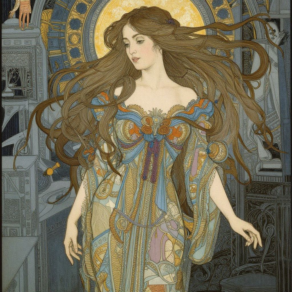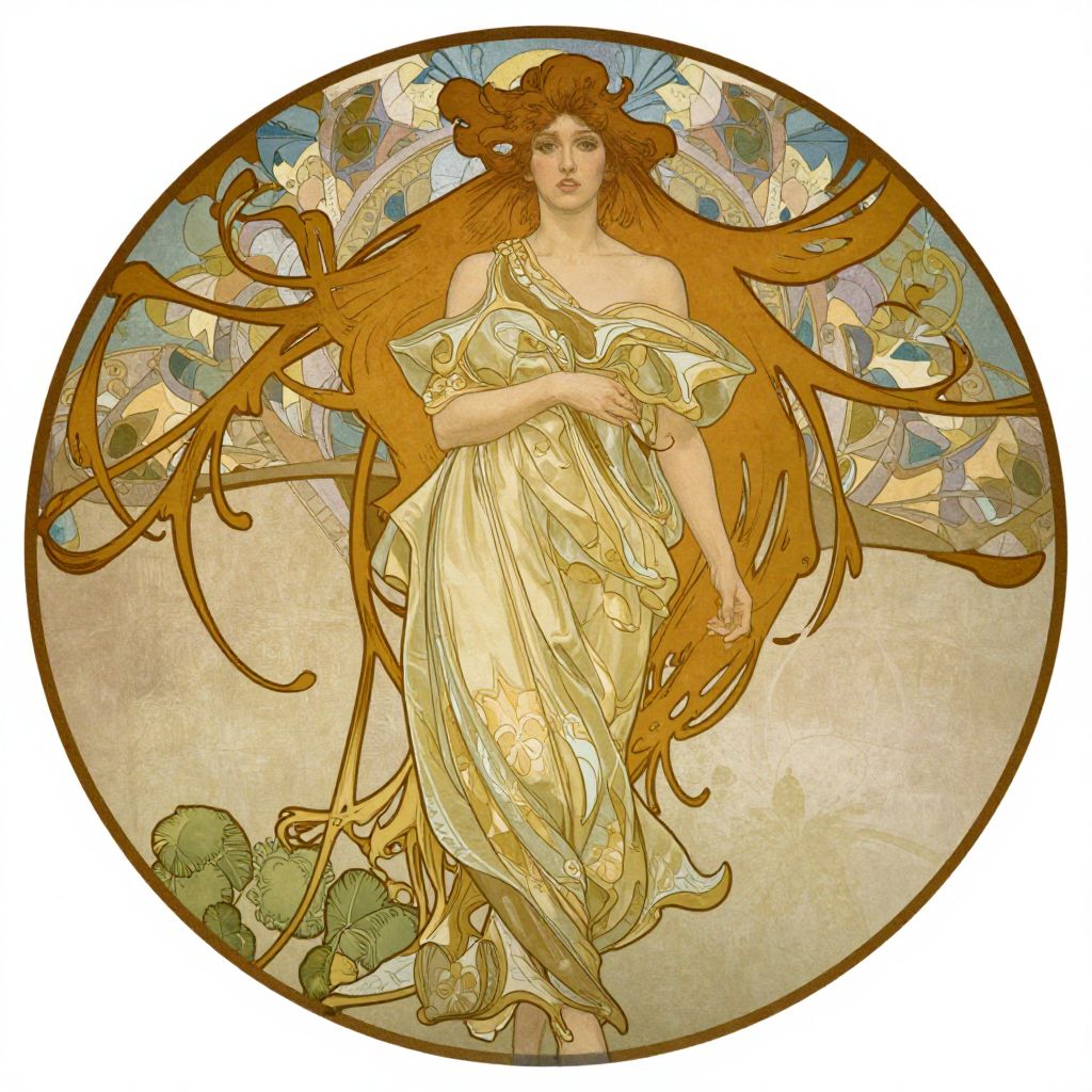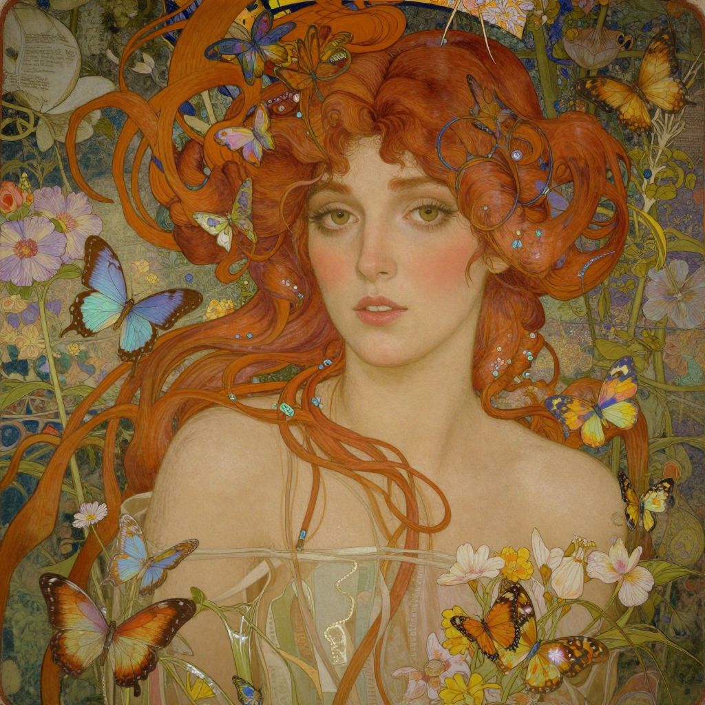 The image depicts a stunning 2.5D relief of an Art Nouveau woman, her flowing hair cascading in a rich tapestry of red, gold, green, and purple hues. The woman's face is serene, framed by an intricate border of leaves and flowers that intertwine with her hair, creating a harmonious blend of nature and human beauty. The leaves, in shades of gold and green, seem to dance around her, while the flowers, in shades of red and purple, add a touch of vibrancy. The scroll border, adorned with delicate patterns, encircles the woman, enhancing the sense of depth and dimension. The overall composition is balanced, with the woman's figure centrally positioned, surrounded by the lush foliage that envelops her, creating a sense of unity and harmony between the subject and her environment.