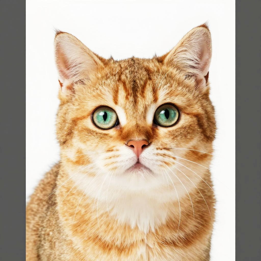 Photograph of a cute, orange tabby cat with bright green, wide eyes and a small, pink nose. Its fur is fluffy and its ears are perked up. The background is plain white, making the cat's vibrant colors stand out. The cat looks slightly surprised or curious. The image has a gray border on both sides.