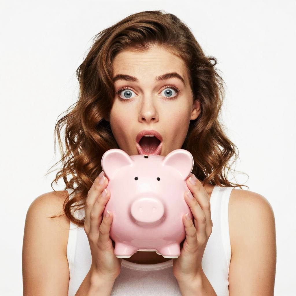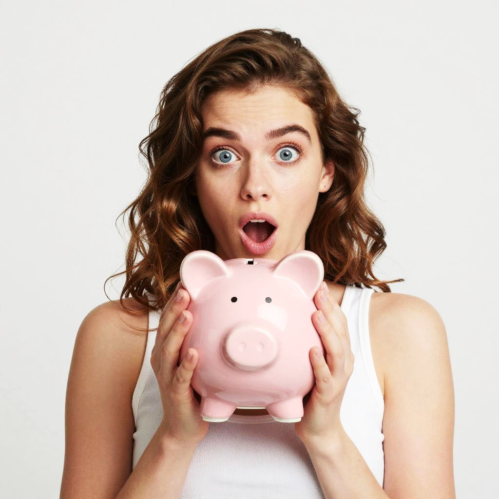 Photograph of a shocked young woman with curly brown hair, wide blue eyes, and open mouth, holding a pink piggy bank against a white background