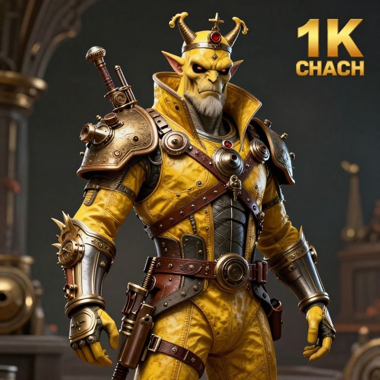 This is a CGI image of a 1K character from a fantasy game, featuring a muscular, horned demon with a white beard and intense expression. He wears a golden, metallic armor with spiked shoulder pads and a high-collared jacket, accented with brown leather straps and belts. A red gemstone is set into his forehead. His left arm is adorned with a large, ornate gauntlet. In the background, blurred, are dark, industrial structures with large gears and arches. The image has a dark, shadowy ambiance, with the text "1K CHACH" in bold, yellow letters in the top right corner.