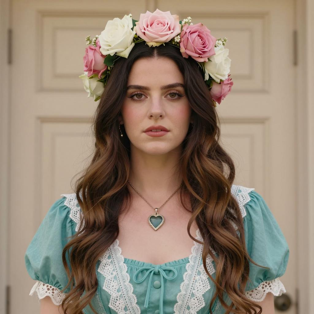 Lana del rey costume, photo of a beautiful woman with long, wavy brown hair, wearing a teal dress with white lace trim, flower crown with pink and white roses, necklace with heart pendant, standing in front of a beige door, soft sunlight, bohemian style, close-up, portrait, detailed ures, realistic lighting