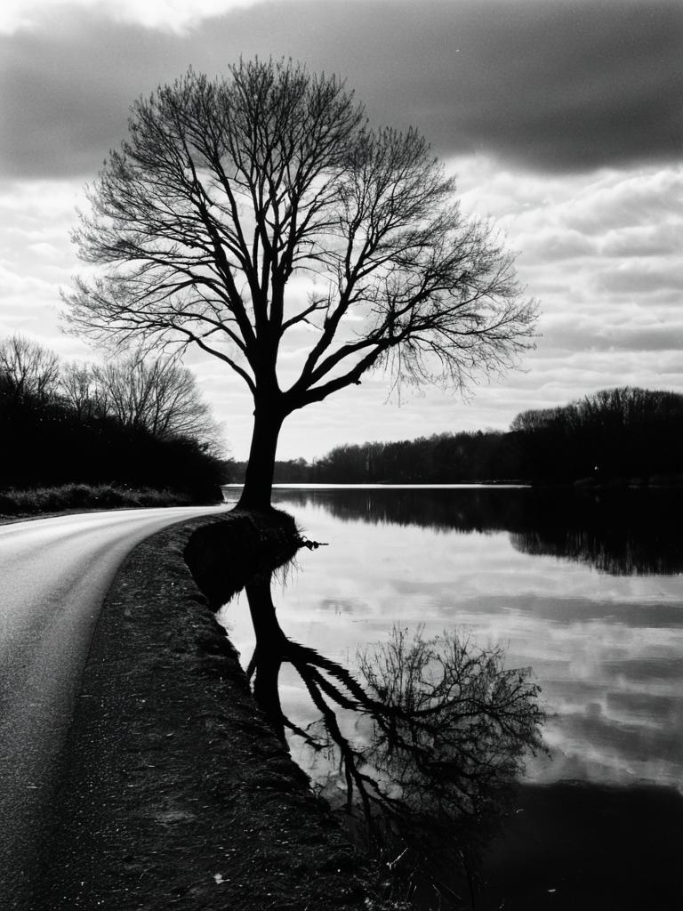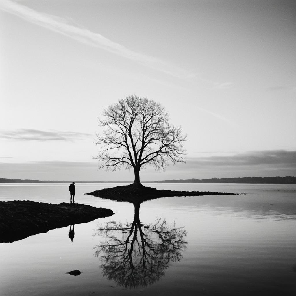 A solitary bare tree on a small island in calm water, a person standing near the tree, black and white minimalistic photography, high contrast, calm and serene atmosphere, smooth gradient sky with soft clouds, reflection of the tree and person in water, quiet and contemplative mood