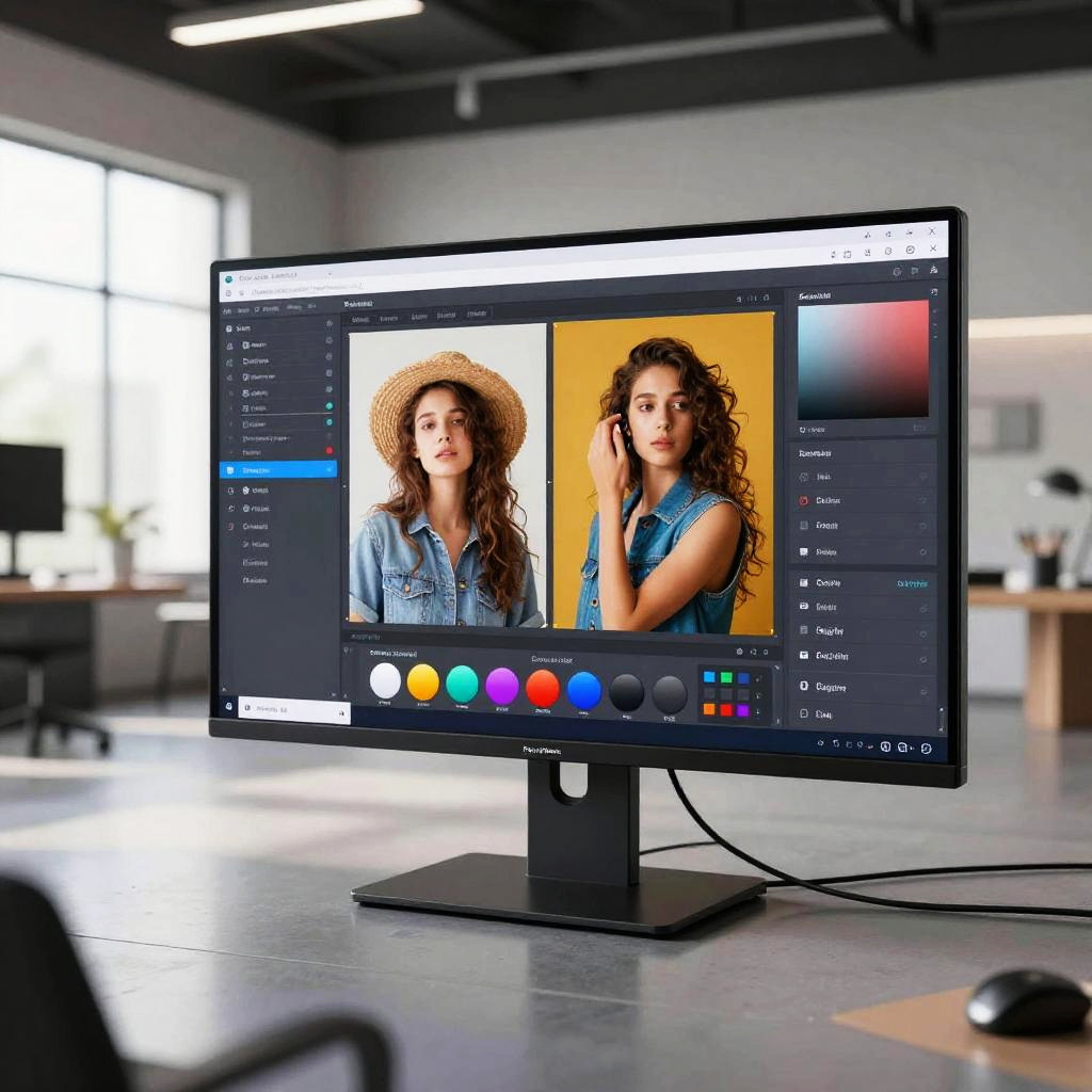 Futuristic scene showing a free online AI photo editor transforming raw images into stunning artworks, holographic user interface, dynamic color palettes, advanced AI enhancements in action, spacious bright digital studio, tech-inspired atmosphere
