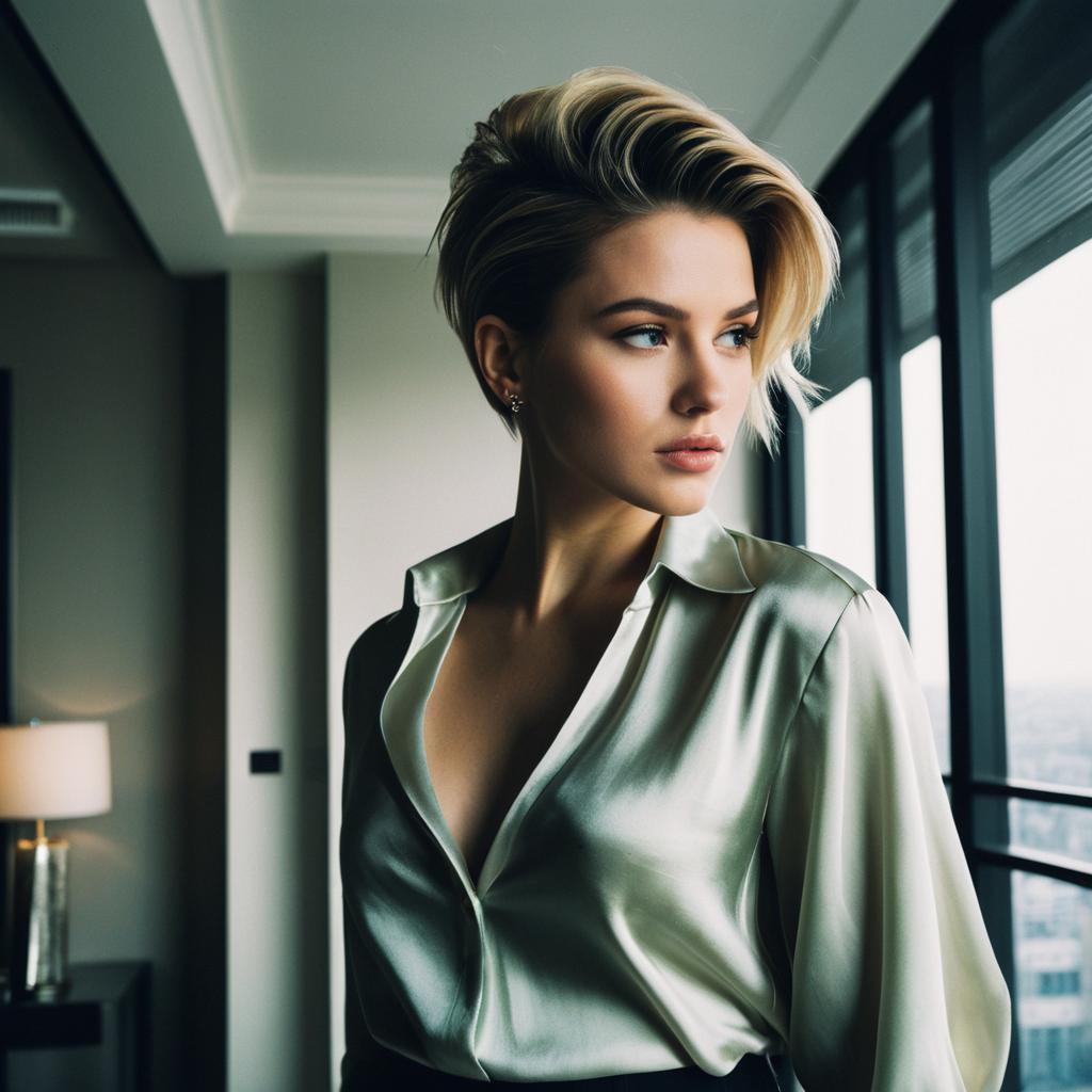 Portrait of a young Caucasian woman with a stylish side swept undercut hairstyle, wearing a shiny silk blouse, standing in a modern luxury penthouse. The image features soft diffused lighting and large windows with a cityscape view in the background, evoking a sophisticated fashion editorial atmosphere.